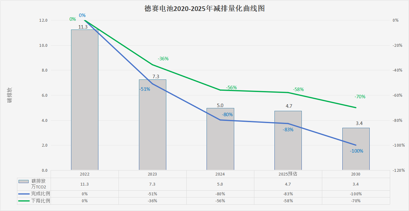 2022年德賽電池(惠南工業(yè)園)的范圍1、2、3碳排放總量約為11.3萬噸,德賽電池通過不懈努力,僅至2024年,公司已成功將碳排放總量削減至約5.0萬噸(已完成80%的目標),實現(xiàn)相對于基準年碳排放總量56%的顯著減排,2025年預計碳排總量約為4.7萬噸(預計完成83%的目標),實現(xiàn)相對